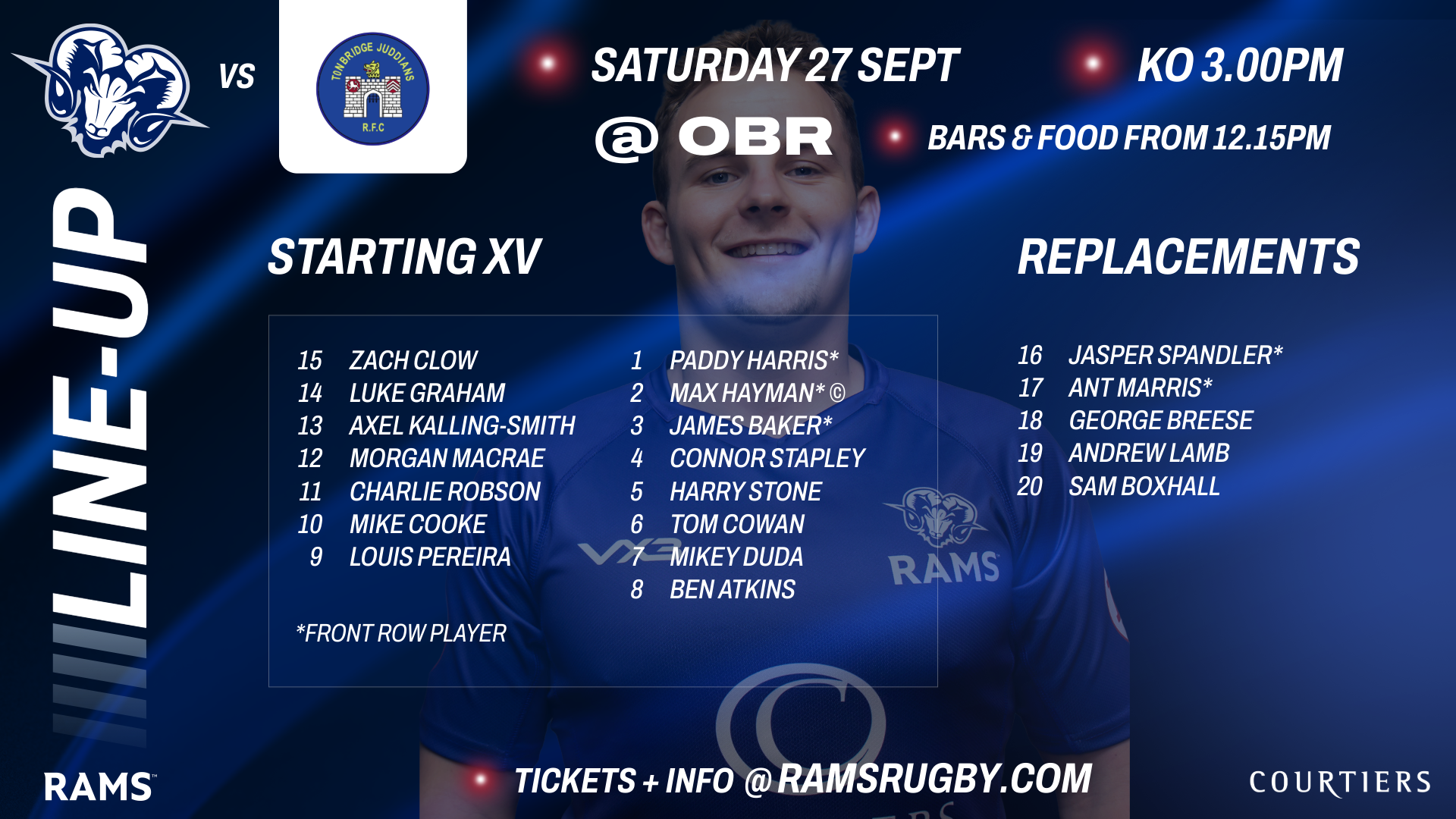 Destructive Mikey Duda retains his place on the open-side, and with Willo Bicknell away for the weekend following another fine display in defeat at Sale FC, another in contention for man-of-the-match at Heywood Road, Ben Atkins, switches to No. 8.